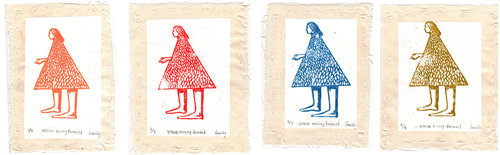 Femininity and geometry are hardly new aesthetic themes in Caitlin Connolly’s artistic body of work. The triangle as both a symbol of and key visual component in depictions of women, girls, and the feminine draws on everyday iconographies (think stick figures and bathroom signs), pop culture (Weezer’s pink triangles), and feminist epic art (Judy Chicago’s The Dinner Party). In Connolly’s work triangles can be bodies and limbs, spatial arrangements, dresses and fabric patterns, facial structures. However formally deployed in composition, though, they invariably encode what is a central thematic preoccupation in her art: feminine expression and feminine identity.